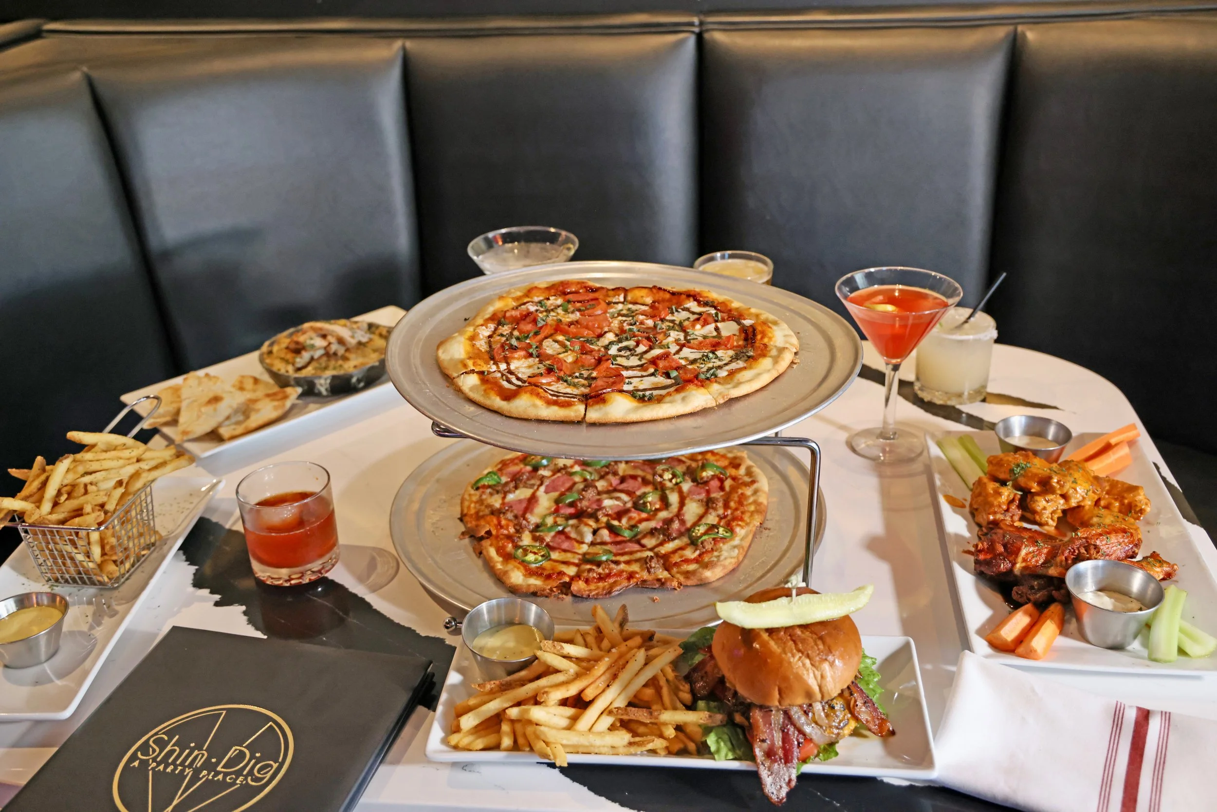 Amazing Food Served Right Around The Corner Our Menu FOOD MENU $13 Lunch Specials Monday - Friday 11am - 5PM $13 CEASAR SALAD WITH CHICKEN TOMATO BASIL SOUP & HALF SANDWICH: MEATBALL SUB / GRILLED CHEESE / HOT ITALIAN PEPPERONI PIZZA CHEESE BURGER & FRIES GRILLED CHICKEN SANDWICH & FRIES CRANBERRY CHICKEN SALAD SANDWICH & ARUGULA SALAD SHIN CHICKEN CLUB & FRIES WITH SLICED CHICKEN-SLICED GREEN APPLES, HONEY GARLIC VINAIGRETTE, TOMATO, LETTUCE MAYO AND MUSTARD SPECIAL SAUCE PROVOLONE CHEESE $3 UPGRADE YOUR LUNCH SIDE POTATO SALAD OR ARUGULA SALAD $3 ARRIVING IN STYLE $13 Crispy Lumpia (Filipino Style egg roll) with Thai Sweet Chili Dipping sauce $13 $12 Truffle Fries $12 $12 House made Fried Mozzarella bites $12 $11 Texas sized Pretzel With Beer Cheese & Spicy Mustard $11 $13 Meatballs 3 House made Meatballs Topped with Mozzarella served in a Hot Skillet with Pita Bread $13 $13 Spinach Artichoke Dip Topped with Sautéed Mushrooms & Onions, Served with Pita Bread $13 $13 Hot Honey Dip Cream Cheese Topped with a Spicy Hot Honey Sauce served with Pita Bread $13 $10 Chips & Queso Tortilla Chips with house made Queso & Salsa $10 $12 Mini Corndogs Served with Spicy Mustard $12 $17 Wings 10 Tossed in: Buffalo, Buffalo Horseradish, Sweet and Spicy, Garlic Parmesan, or Lemon Pepper $17 $2 Extra Pita Bread or Chips $2 Getting the Party Started $13 Caprese Salad Fresh Mozzarella & Tomatoes Topped with Basil, Olive Oil, & Balsamic Vinaigrette $13 $11 / Add Chicken or Shrimp +$5 Caesar Salad $11 / Add Chicken or Shrimp +$5 A Couple of Drinks In... $17 The Burger Double Akaushi Beef Patty with Cheddar, Bacon, Lettuce Tomato, Grilled Onions, & House Made Burger Sauce on Brioche Bun. Served with fries $17 $15 The Grilled Chicken Sandwich Two Full Chicken Breasts with Lettuce, Tomato, Bacon, & Chipotle Mayo on Brioche Bun. Served with Fries. $15 $15 Hot Italian Sub Spicy Mustard, Black Olives, Vinaigrette, Pepperoni, Smoked Ham, Canadian Bacon, Capacola, & Salami. Served with Fries $15 $16 Meatball Sub House Made Meatballs, Marinara Sauce, & Mozzarella Cheese. Served with Fries. $16 $18 Monterey Chicken Poblano Sauce, Onions, Mushrooms, & Mozzarella served in a Skillet. Served with fries or side salad. $18 $14 4 Grilled Cheese & Tomato Soup Goat Cheese, Cheddar, Provolone, & Gouda $14 $39 Ribeye 12oz Angus Beef Ribeye cooked how you'd like, Served with Cowboy Butter & A Creamy Horseradish Sauce. Served with fries & side salad $39 $14 8 Shrimp Plate with Fries Grilled or Fried $14 $25 16 Shrimp Plate with Fries Grilled or Fried $25 $16 / Add Meatball +$4 / Bacon +$2 / Chicken +$5 Truffle Mac 'N Cheese $16 / Add Meatball +$4 / Bacon +$2 / Chicken +$5 Time to Hit the Dance Floor... (All 12" Pizzas, Sub Cauliflower Crust +$5) $17 The Lonely Cheese House Made Red Sauce, Fontina, Mozzarella, & Herb Mix $17 $18 The Okie Dokie Artichokie spinach-artichoke base, mozzarella, mushroom, arugula, truffle oil $18 $19 The Shin Pig house made red sauce, mozz, Canadian bacon, pepperoni, prosciutto, capicola, smoked ham, genoa salami sausage $19 $17 The Bee Sting house made red sauce, mozzarella, salami, sausage, jalapeño, spicy honey sauce $17 $17 The Margheritaaaahhh light red sauce, fresh mozzarella, fresh tomatoes, fresh basil, balsamic glaze $17 $19 The Stinky Cheese house made red sauce, pepperoni, sausage, mushrooms, bleu cheese, gorgonzola $19 The After Party! $11 King's New York Chocolate Tres Leches Cheesecake $11